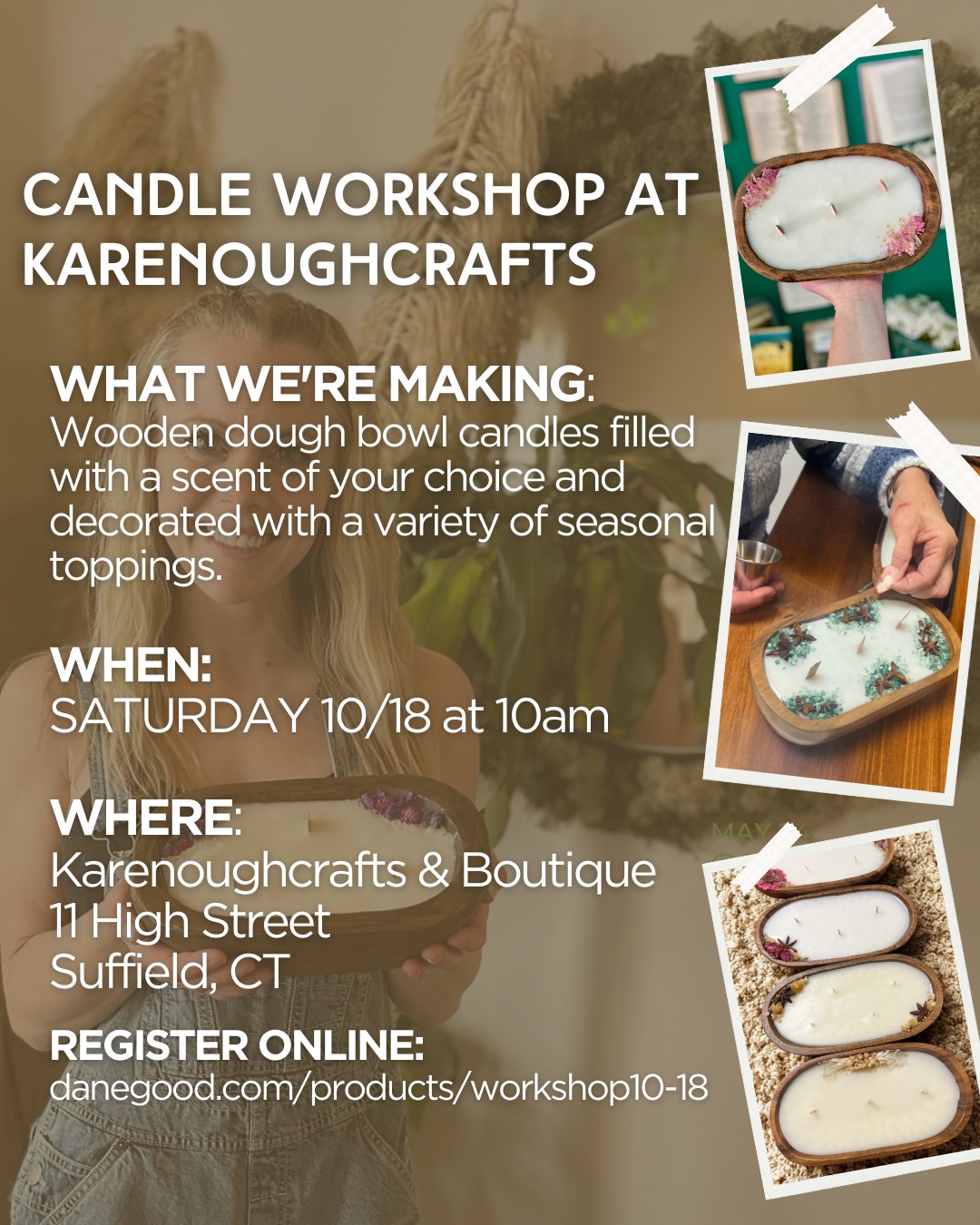 Join us for a Candle Workshop at Karenoughcrafts & Boutique in Suffield! WHAT WE'RE MAKING: Wooden dough bowl candles filled with a scent of your choice, 3 wicks, and decorated […]