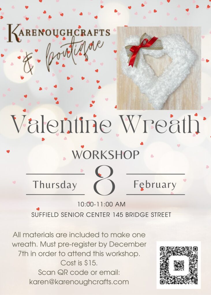 Join Karen from Karenoughcrafts for a Valentine Wreath workshop at the Suffield Senior Center. 2/8 at 10 am Sorry, no refunds